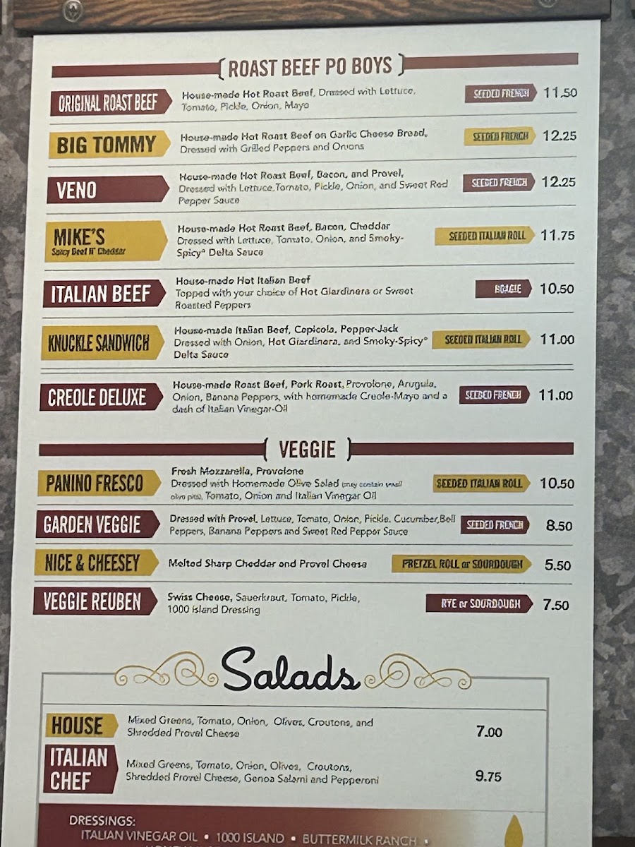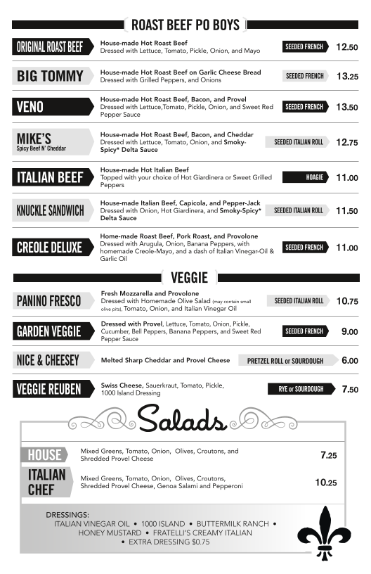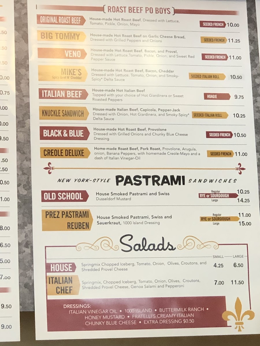 Highlights include flavorful choices like the Prez Pastrami Reuben, the Creole Deluxe, and the BBQ Pulled Pork sandwich. There’s also room for fresh salads and sides such as loaded potato salad or chips, making it easy to tailor your meal to your mood. For drinks, enjoy fountain sodas and freshly brewed teas with free refills, alongside some specialty options like Mississippi Mud Coffee and craft micro-beers.